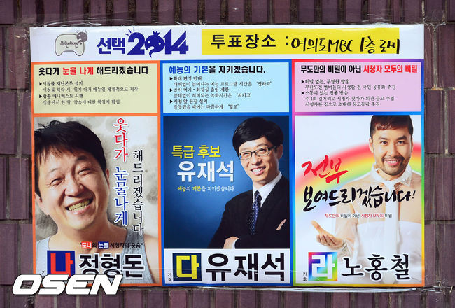 앞서 ‘무한도전’은 차세대 리더를 선출하기 위한 ‘선택 2014’ 특집으로 17~18일 사전 투표를 전국 10개 지역 11개 투표소에서 진행했다. 사전 투표에는 3만 명이 넘는 인원이 참여하며 ‘무한도전’의 큰 영향력을 확인하게 했다.