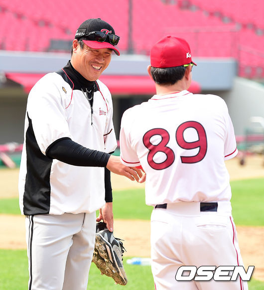 경기에 앞서 LG 정현욱이 KIA 한대화 코치와 이야기를 나누고 있다.