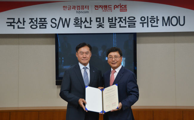 국산 정품 소프트웨어 확산을 위해 업무협약을 체결한 이홍구 한글과컴퓨터 대표이사(오른쪽)와 김병한 전자랜드 상품본부장.