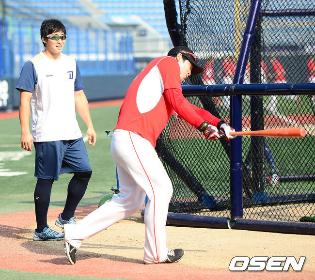 22일 오후 창원 마산구장에서 열리는 '2014 한국야쿠르트 세븐 프로야구' NC 다이노스와 SK 와이번스의 경기에 앞서 NC 나성범이 SK 정상호와 이야기를 나누고 있다.