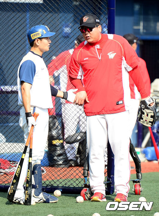 22일 오후 창원 마산구장에서 열리는 '2014 한국야쿠르트 세븐 프로야구' NC 다이노스와 SK 와이번스의 경기에 앞서 NC 손시헌이 SK 채병룡과 이야기를 나누고 있다.