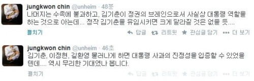 이에 진 교수는 22일 자신의 트위터를 통해 "나머지는 수족에 불과하고, 김기춘이 정권의 브레인으로서 사실상 대통령 역할을 하는 것으로 아는데... 정작 김기춘을 유임시키면 크게 달라질 것은 없을 듯"이라고 꼬집고는 "김기춘, 이정현, 길환영 물러나게 하면 대통령 사과의 진정성을 입증할 수 있었을텐데... 역시 무리한 기대였나 봅니다"라며 말을 맺었다.