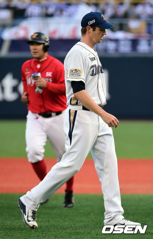 1회초 수비를 마치고 NC 찰리가 더그아웃으로 들어가고 있다.
