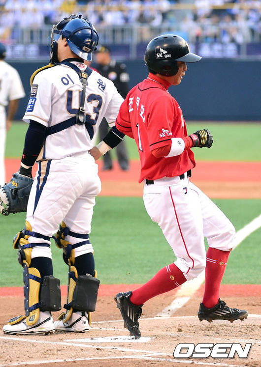 1회초 2사 2루 SK 조동화가 이재원의 적시타로 득점을 올리고 있다.