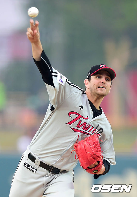 1회말 무사에서 LG 선발투수 리오단이 힘차게 공을 던지고 있다.