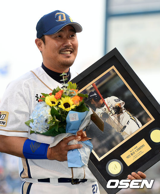 경기에 앞서 NC 이호준의 개인 통산 1500안타 시상식에서 이호준이 포토타임을 갖고 있다.