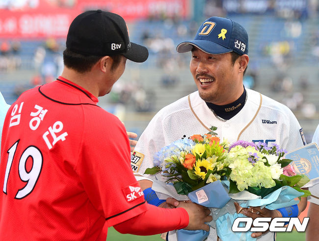 경기에 앞서 NC 이호준의 개인 통산 1500안타 시상식에서 SK 임경완에게 꽃다발을 건네받고 있다.