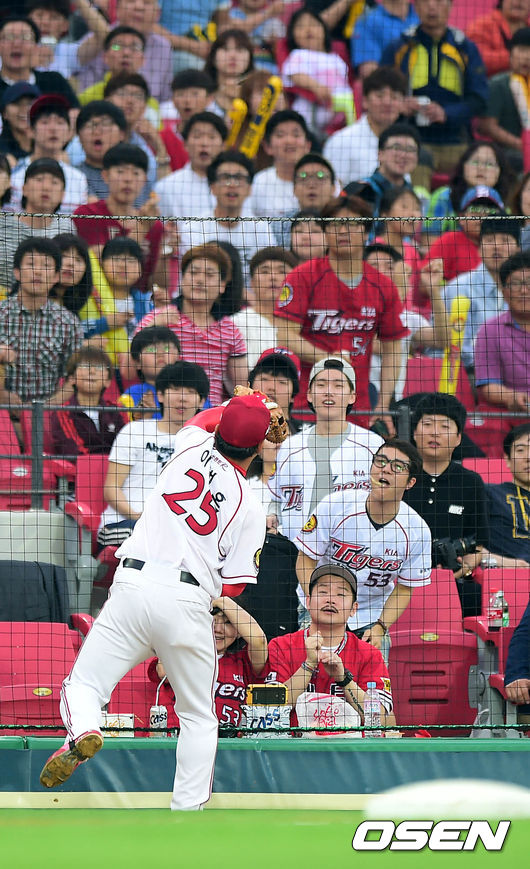 2회초 1사 1,3루 KIA 이범호가 LG 박용택을 파울플라이로 처리하고 있다.