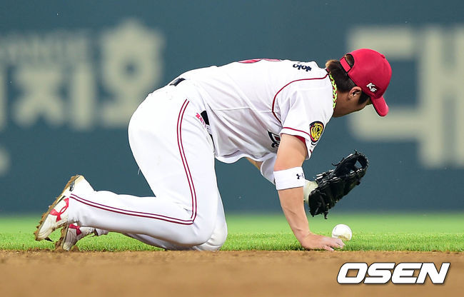 3회초 2사 3루에서 KIA 안치홍이 그라운드에 미끄러지며 LG 최경철의 타구를 놓쳐 실점을 허용하고 있다.