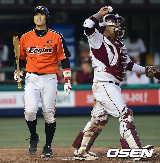 22일 오후 서울 목동구장에서 열린 ‘2014 한국야쿠르트 세븐 프로야구’ 넥센 히어로즈와 한화 이글스의 경기, 4회초 1사 주자 만루 한화 정범모가 타석에서 루킹 삼진을 당하고 있다.