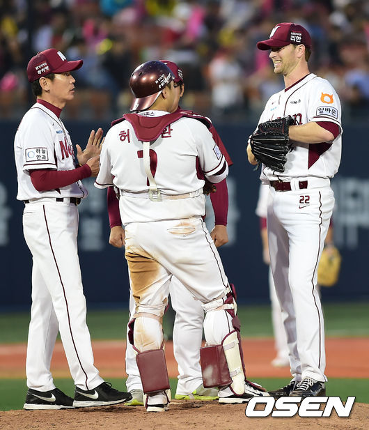 22일 오후 서울 목동구장에서 열린 ‘2014 한국야쿠르트 세븐 프로야구’ 넥센 히어로즈와 한화 이글스의 경기, 4회초 2사 주자 만루 이용규에게 밀어내기 볼넷을 허용한 넥센 선발 밴 헤켄이 이강철 코치와 얘기를 나눌때 아쉬워하고 있다.