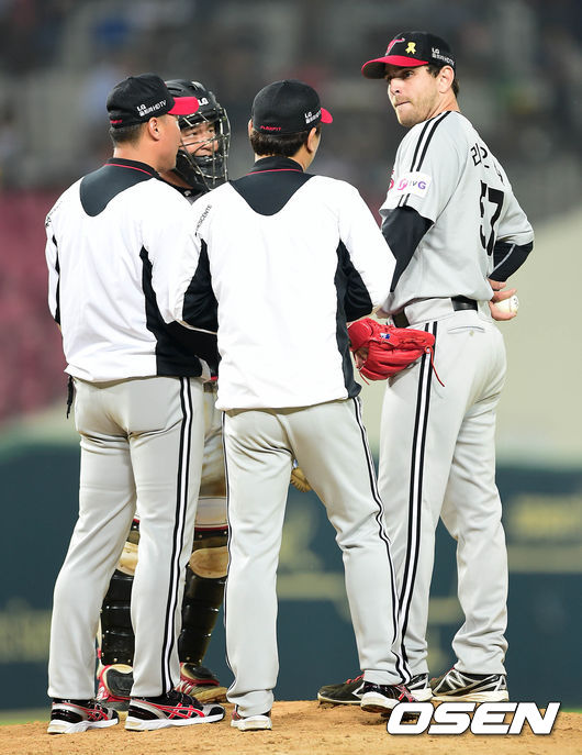 3회말 무사 만루에서 마운드를 방문한 LG 강상수 코치가 리오단과 이야기를 나누고 있다.