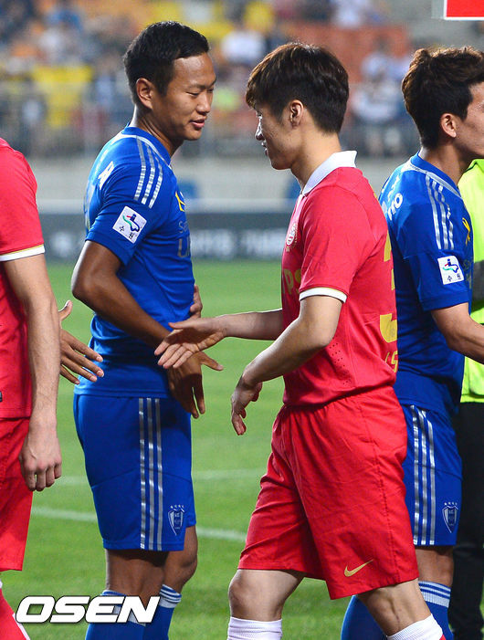 22일 오후 경기도 수원월드컵경기장에서 열린 '2014 PSV 에인트호벤 코리아투어 1차전' 수원 삼성과 에인트호벤의 경기에 앞서 수원 정대세와 에인트호벤 박지성이 악수를 나누고 있다.