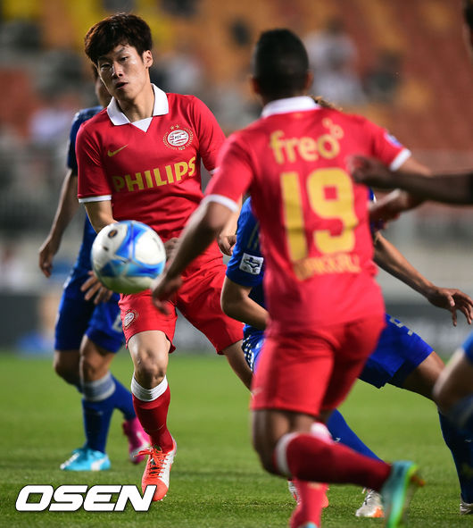 22일 오후 경기도 수원월드컵경기장에서 열린 '2014 PSV 에인트호벤 코리아투어 1차전' 수원 삼성과 에인트호벤의 경기, 전반 에인트호벤 박지성이 패스를 성공시키고 있다.
