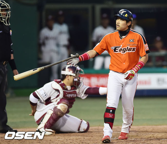 22일 오후 서울 목동구장에서 열린 ‘2014 한국야쿠르트 세븐 프로야구’ 넥센 히어로즈와 한화 이글스의 경기, 4회초 2사 주자 만루 한화 이용규가 볼넷을 골라내며 밀어내기 볼넷으로 선취점을 올리고 있다.
