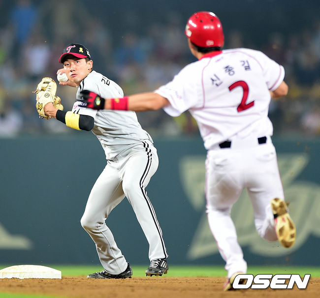 3회말 1사 1,3루 KIA 나지완의 병살타때 LG 김용의가 1루주자 신종길을 포스아웃 처리하고 있다.