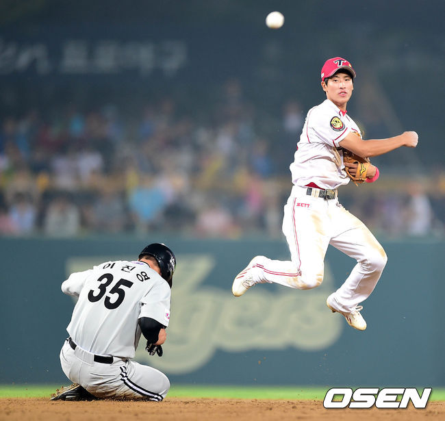 4회초 1사 1루에서 LG 정의윤의 병살타때 KIA 강한울이 1루주자 이진영을 포스아웃 처리하고 있다.