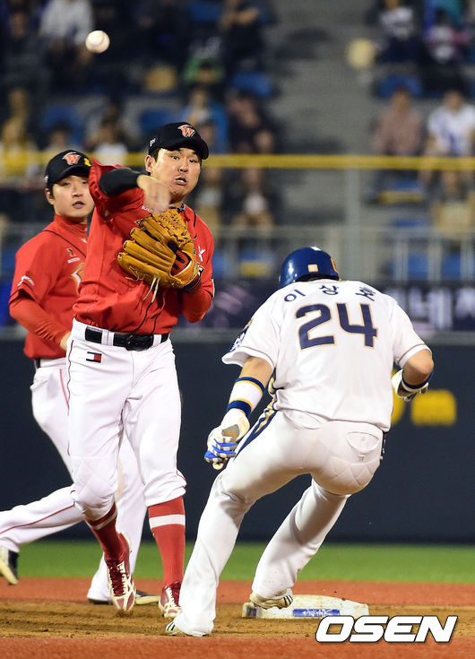 7회말 1사 1루 SK 나주환이 NC 박정준의 내야 땅볼 타구를 잡아 1루 주자 이상호를 포스아웃으로 잡아낸 뒤 1루로 송구하고 있다.