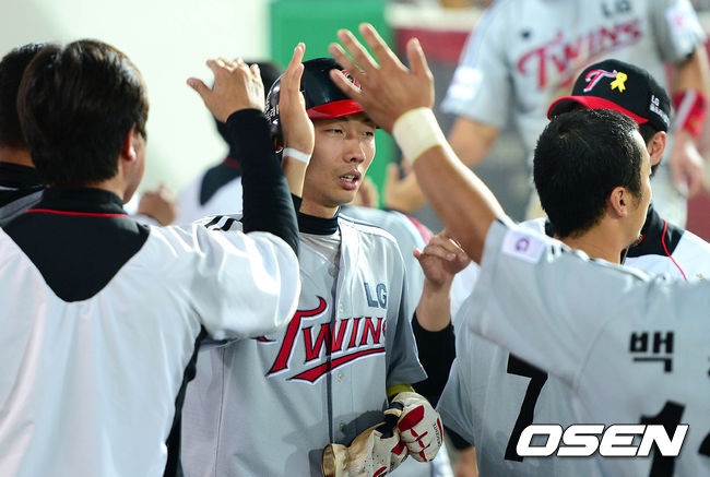 5회초 1사 만루에서 LG 오지환의 우전 2타점 적시타때 홈을 밟은 2루주자 김용의가 더그아웃에서 동료들과 하이파이블를 하고 있다.