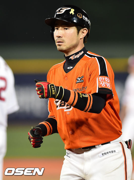22일 오후 서울 목동구장에서 열린 ‘2014 한국야쿠르트 세븐 프로야구’ 넥센 히어로즈와 한화 이글스의 경기, 6회초 1사 주자 2,3루 한화 한상훈이 좌익수 앞 1타점 적시타를 날린 후 1루에서 기뻐하고 있다.