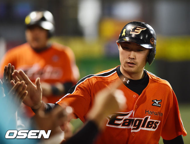 22일 오후 서울 목동구장에서 열린 ‘2014 한국야쿠르트 세븐 프로야구’ 넥센 히어로즈와 한화 이글스의 경기, 6회초 2사 주자 2,3루 한화 김경언의 2타점 적시타때 홈을 밟은 김태균과 송광민이 덕아웃에서 동료들과 하이파이브를 하고 있다.
