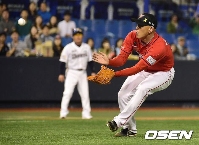 8회말 무사 2루 SK 박정배가 NC 나성범의 번트 타구를 노바운드로 잡아내고 있다.