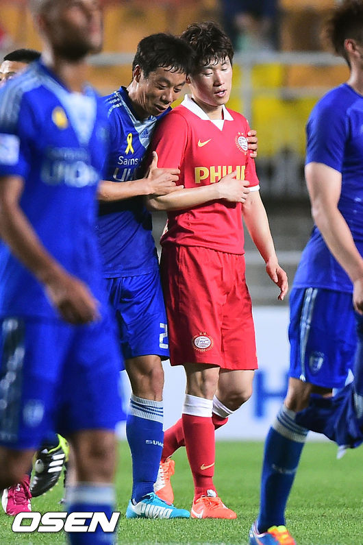 22일 오후 경기도 수원월드컵경기장에서 열린 '2014 PSV 에인트호벤 코리아투어 1차전' 수원 삼성과 에인트호벤의 경기,전반 종료 후 수원 염기훈이 에인트호벤 박지성과 이야기를 나누고 있다,