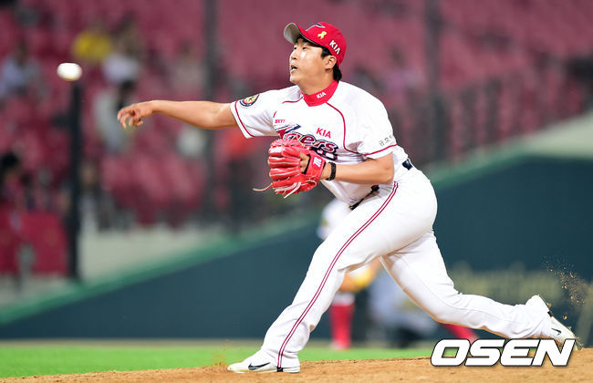 7회초 KIA 김지훈이 힘차게 공을 던지고 있다.