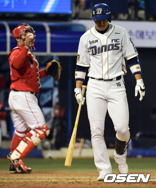 8회말 2사 1,2루 NC 모창민이 포수 스트라이크 낫아웃으로 아웃 당한 뒤 더그아웃으로 들어가고 있다.