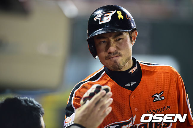 22일 오후 서울 목동구장에서 열린 ‘2014 한국야쿠르트 세븐 프로야구’ 넥센 히어로즈와 한화 이글스의 경기, 7회초 1사 주자 3루 한화 김태균의 중견수 앞 1타점 적시타 때 홈을 밟은 한상훈이 덕아웃에서 동료들과 하이파이브를 하고 있다.