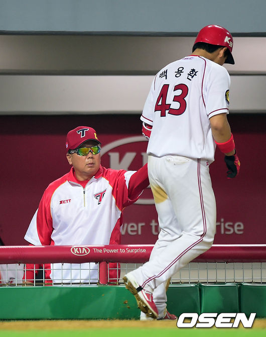 7회말 무사에서 KIA 백용환이 좌월 솔로 홈런을 치고 더그아웃에서 선동렬 감독과 하이파이브를 하고 있다.