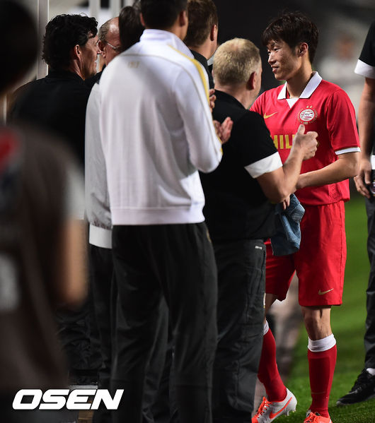22일 오후 경기도 수원월드컵경기장에서 열린 '2014 PSV 에인트호벤 코리아투어 1차전' 수원 삼성과 에인트호벤의 경기,후반 에인트호벤 박지성이 교체되며 동료들의 축하를 받고 있다.
