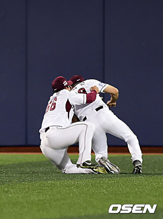 22일 오후 서울 목동구장에서 열린 ‘2014 한국야쿠르트 세븐 프로야구’ 넥센 히어로즈와 한화 이글스의 경기, 7회초 2사 주자 1,2루 한화 고동진의 플라이 타구를 처리하는 과정에서 넥센 강지광과 이택근이 충돌하고 있다.