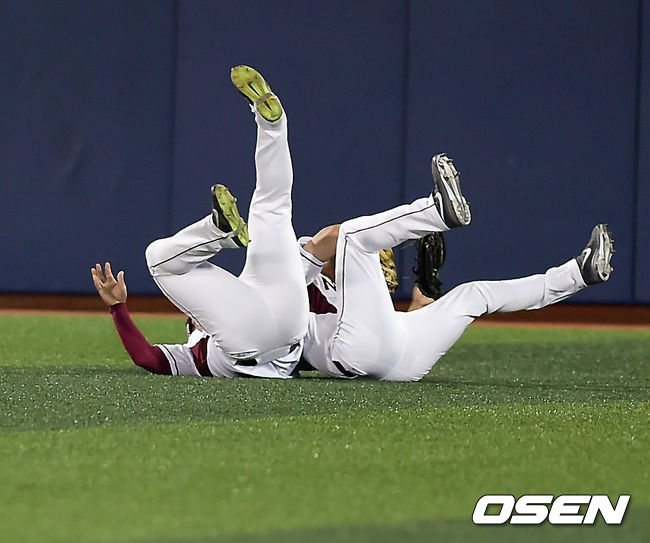 22일 오후 서울 목동구장에서 열린 ‘2014 한국야쿠르트 세븐 프로야구’ 넥센 히어로즈와 한화 이글스의 경기, 7회초 2사 주자 1,2루 한화 고동진의 플라이 타구를 처리하는 과정에서 넥센 강지광과 이택근이 충돌하고 있다.