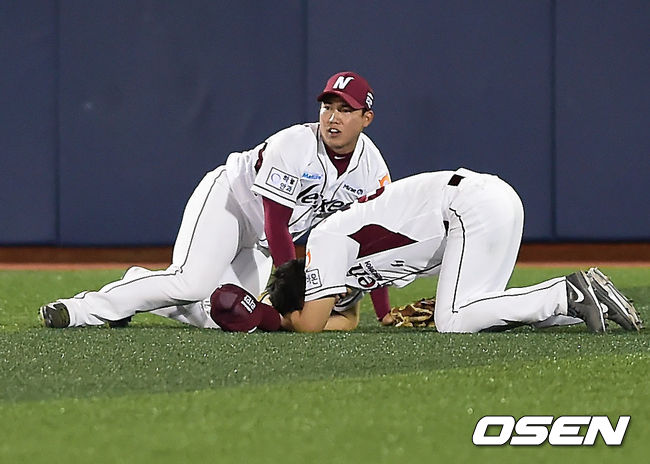 22일 오후 서울 목동구장에서 열린 ‘2014 한국야쿠르트 세븐 프로야구’ 넥센 히어로즈와 한화 이글스의 경기, 7회초 2사 주자 1,2루 한화 고동진의 플라이 타구를 처리하는 과정에서 넥센 강지광과 이택근이 충돌한 후 고통스러워 하고 있다.