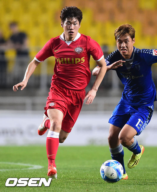 22일 오후 경기도 수원월드컵경기장에서 열린 '2014 PSV 에인트호벤 코리아투어 1차전' 수원 삼성과 에인트호벤의 경기,후반 에인트호벤 박지성이 드리블을 하고 있다.