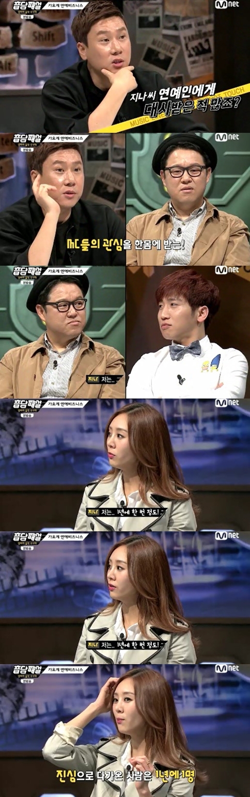 22일 방송된 케이블채널 Mnet '음담패설' 7화에서는 ‘가요계 연애 비즈니스’를 집중 분석, 게스트로 가수 지나가 출연해 MC 김구라, 유세윤, 이상민, 이단옆차기와 함께 대화를 나눴다.