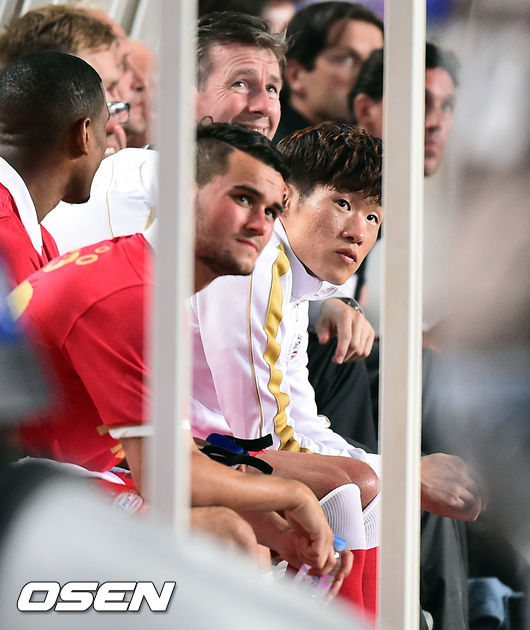 22일 오후 경기도 수원월드컵경기장에서 열린 '2014 PSV 에인트호벤 코리아투어 1차전' 수원 삼성과 에인트호벤의 경기, 후반 교체된 박지성이 선수들의 경기를 지켜보고 있다.