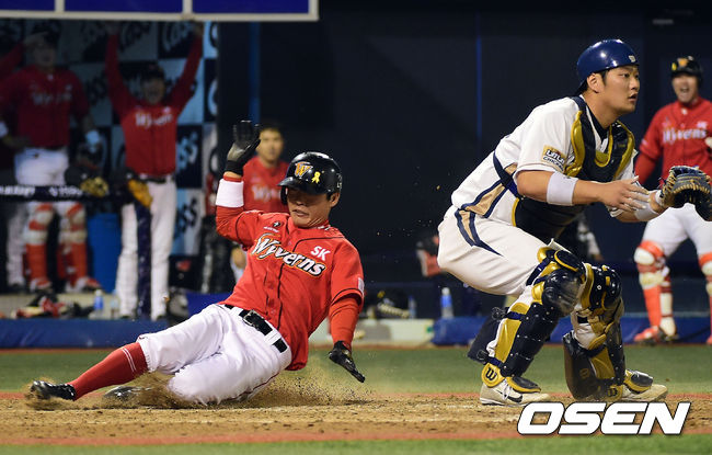 연장 10회초 1사 2루 SK 조동화가 임훈의 적시타로 득점을 올리고 있다.