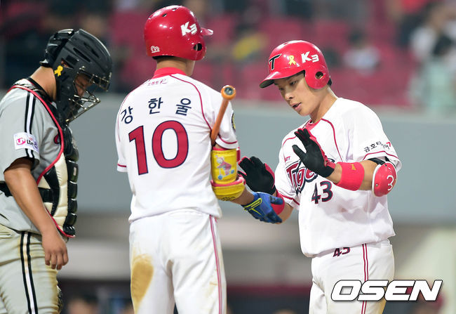 9회말 KIA 백용환이 우월 솔로 홈런을 치고 홈에서 강한울과 하이파이브를 하고 있다.