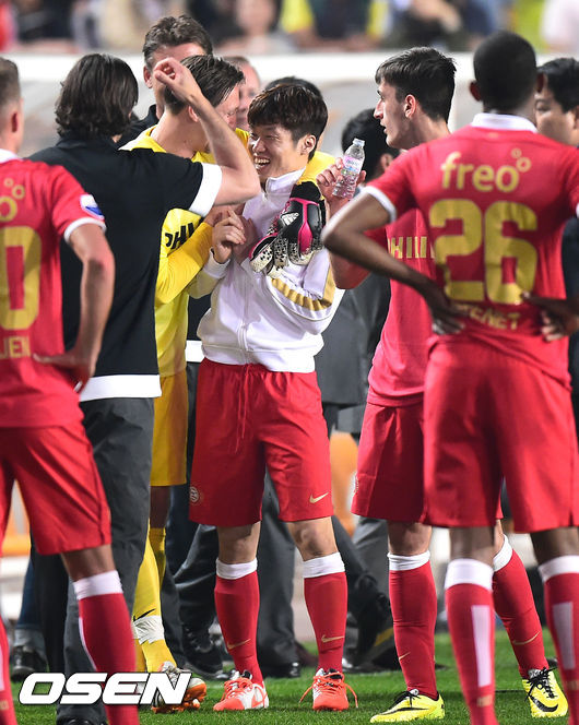 경기종료 후 박지성이 팀동료들의 축하를 받으며 미소 짓고 있다. /soul1014@osen.co.kr