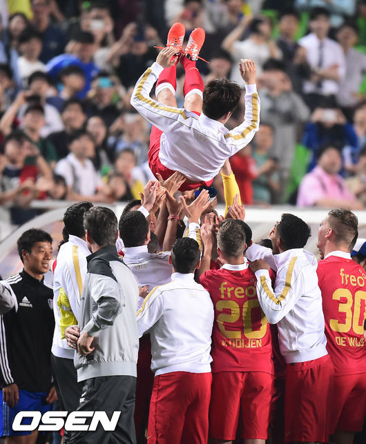 경기종료 후 박지성이 헹가래를 받고 있다./soul1014@osen.co.kr
