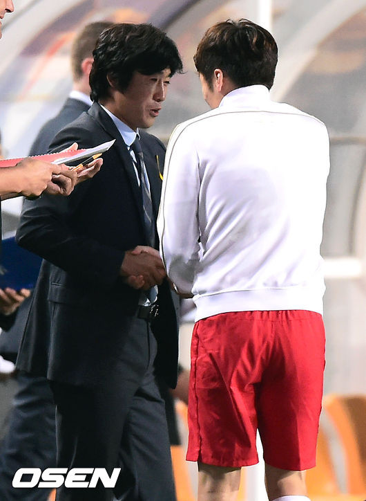경기종료 후 박지성이 서정원 감독을 찾아가 악수를 나누고 있다./soul1014@osen.co.kr