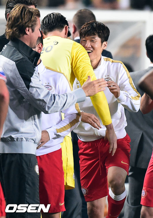 경기종료 후 박지성이 동료들과 포옹을 하고 있다./soul1014@osen.co.kr