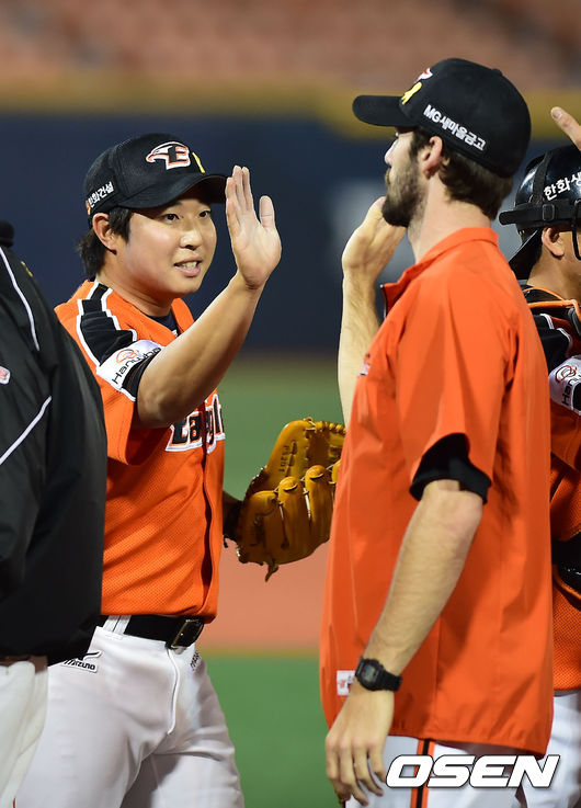 경기를 마치고 한화 황재규와 클레이가 하이파이브를 하고 있다./ rumi@osen.co.kr