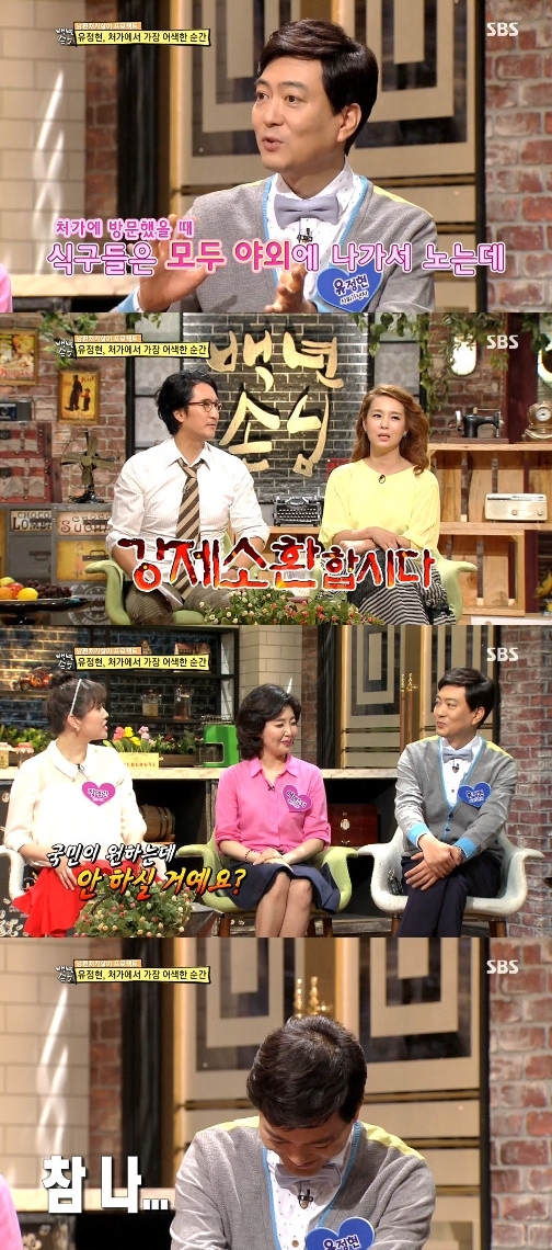유정현은 22일 오후 방송된 SBS 예능프로그램 '자기야-백년손님'(이하 '자기야')에서 15년 차 사위로서 장인, 장모와 불편한 점이 있었냐는 질문에 “야구를 좋아해서 모두다 나가서 노는데 티비를 통해 야구를 보고 있었던 적이 있다”고 말해 MC들과 게스트들에게 야유를 받았다.