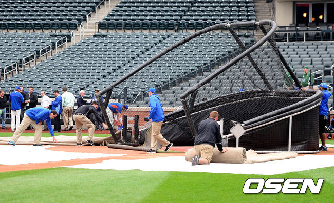 23일(이하 한국시간) 미국 뉴욕주 뉴욕 퀸스 시티 필드에서 열리는 '2014 메이저리그' 뉴욕 메츠와 LA 다저스의 경기 시작전 그라운드 스텝들이 배팅 케이지를 철수하고 있다.