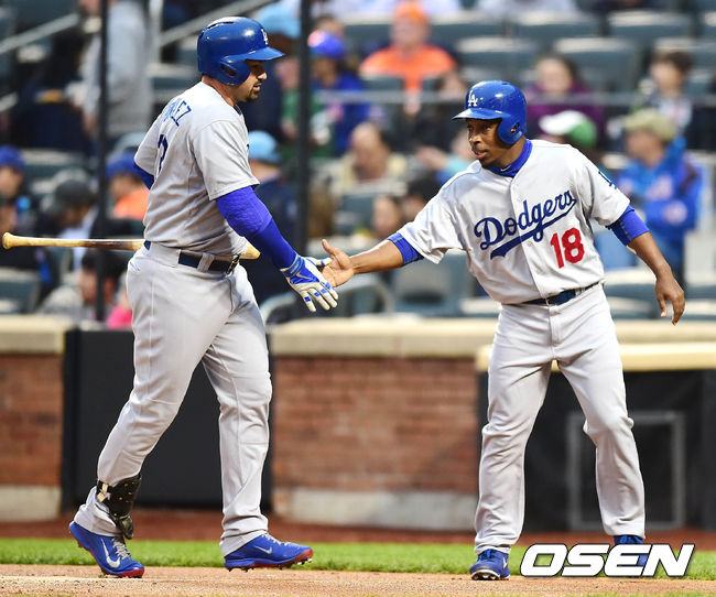 23일(이하 한국시간) 미국 뉴욕주 뉴욕 퀸스 시티 필드에서 열린 '2014 메이저리그' 뉴욕 메츠와 LA 다저스의 경기 1회초 1사 1,3루 곤살레스가 희생플라이를 치고 덕아웃으로 향하며 득점한 3루주자 피긴스와 하이파이브를 하고 있다.