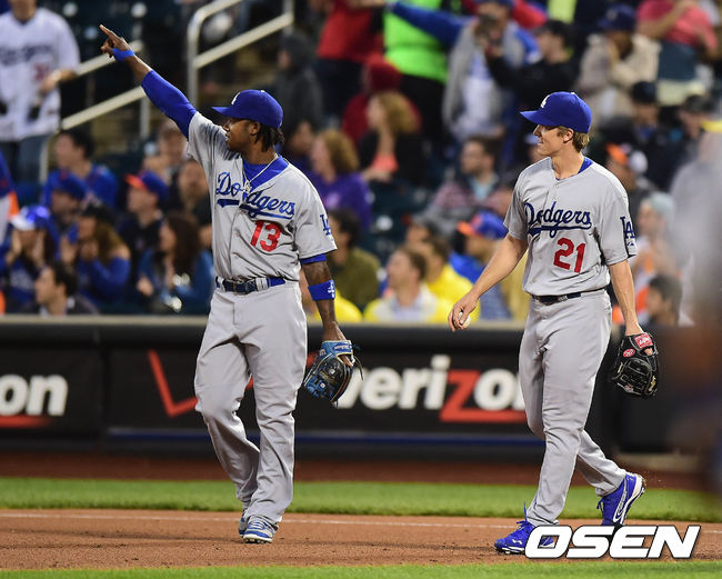 23일(이하 한국시간) 미국 뉴욕주 뉴욕 퀸스 시티 필드에서 열린 '2014 메이저리그' 뉴욕 메츠와 LA 다저스의 경기 2회말 1사 1루 우익수 푸이그가 플로레스의 타구를 다이빙 캐치로 잡자 라미레스(왼쪽)와 그레인키가 푸이그를 보며 격려를 보내고 있다.