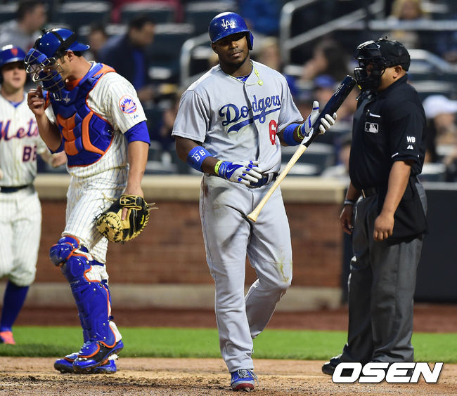 23일(이하 한국시간) 미국 뉴욕주 뉴욕 퀸스 시티 필드에서 열린 '2014 메이저리그' 뉴욕 메츠와 LA 다저스의 경기 3회초 1사 푸이그가 삼진을 당하고 아쉬워 하고 있다.